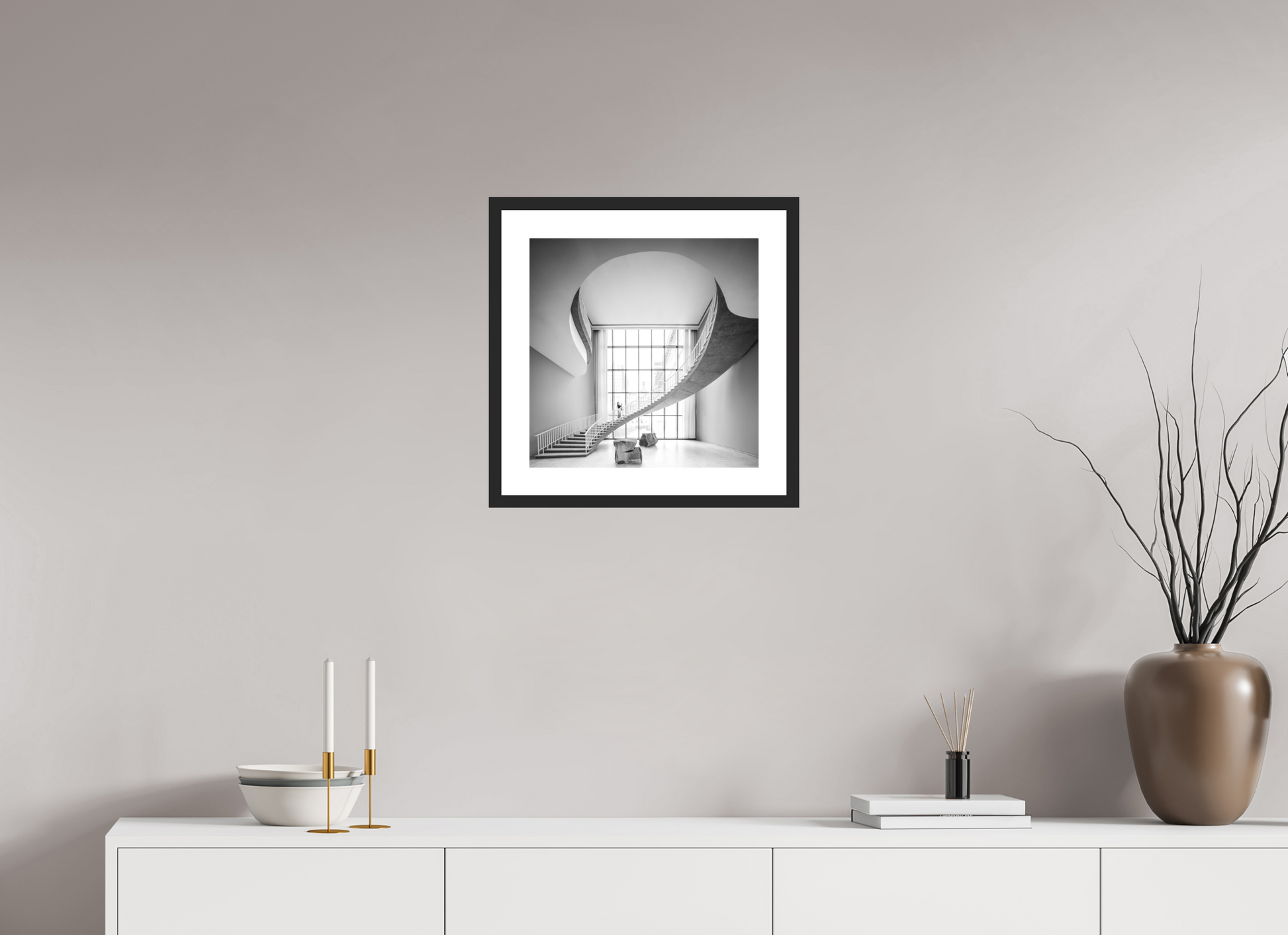 Chicago presents a scene defined by its monumental brightness and soaring geometric lines. The sweeping spiral staircase climbs elegantly toward light filtering through expansive glass facades. That small silhouette of a woman provides profound human scale within such massive structural space. Acquire this captivating fusion between motion and silence as an exclusive limited edition for your collection.