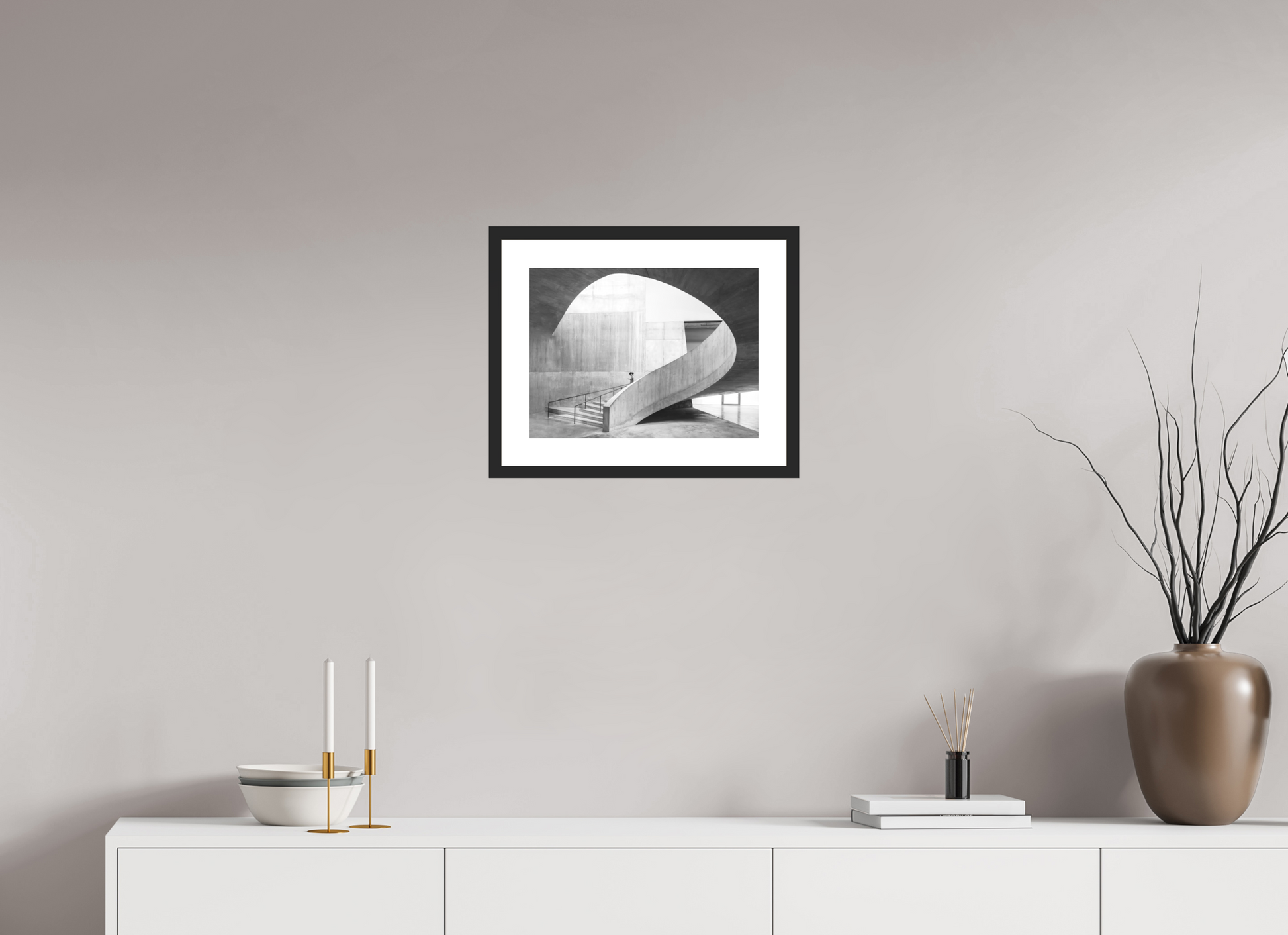 Ticino reveals itself through rhythmic pipes, guiding our eyes toward a silent invitation. Concrete circles frame that distant table where time seems to stand still. This composition balances architectural weight with an airy sense of freedom. Enhance your living space using such a precise masterpiece of modern photography.